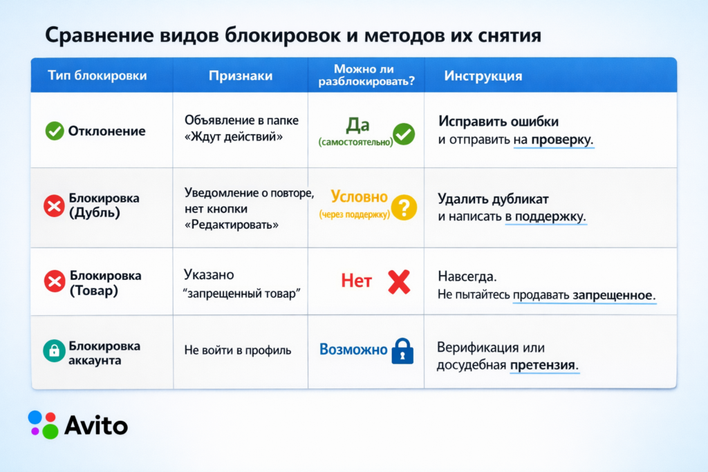Прежде чем искать способы разблокировки, нужно определить статус вашего объявления. От этого зависит стратегия действий.