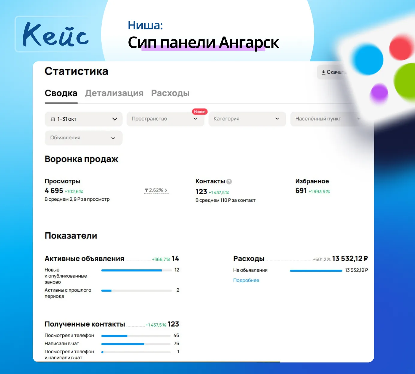 Наш клиент занимался продажей СИП-панелей в Ангарске, но за долгое время его объявления почти не приносили контактов. Он размещал около 14 объявлений на разных площадках, но ежедневно приходило максимум 1–2 запроса. Потенциальные покупатели уходили к конкурентам, продажи шли вяло и клиент был на грани отказа от онлайн-продаж.